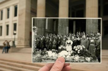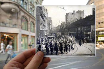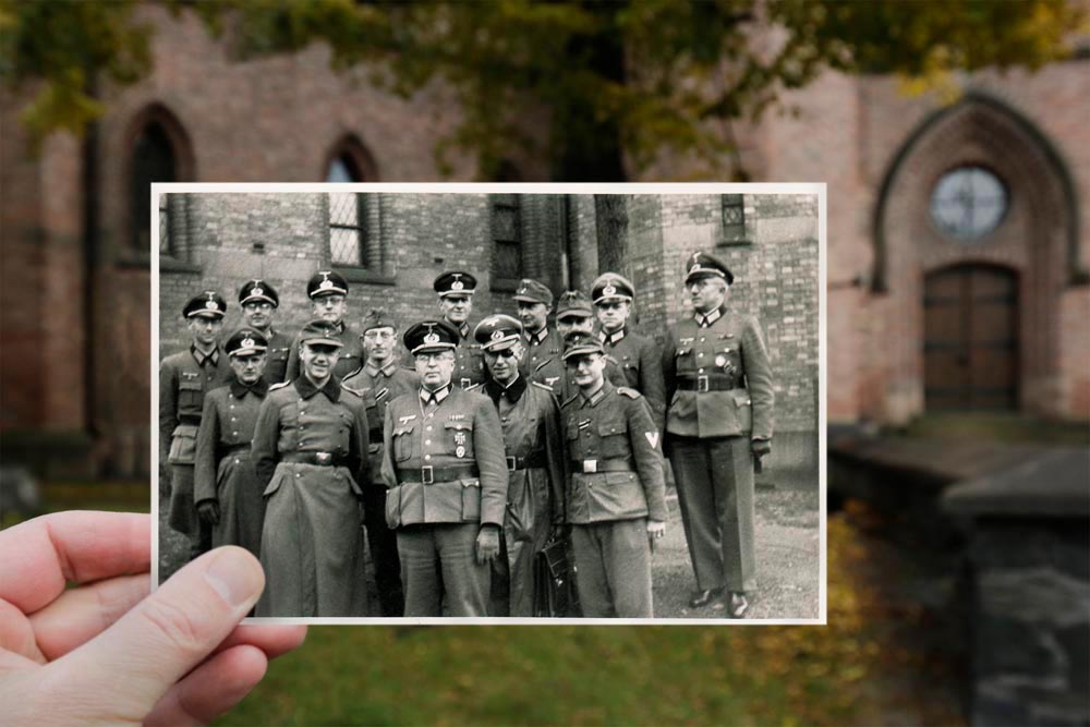 Only a large flag with swastika reminds of the war. The building with the flag was confiscated by the occupation authorities and used as an exclusive restaurant “Deutsches Haus” serving only officers.
