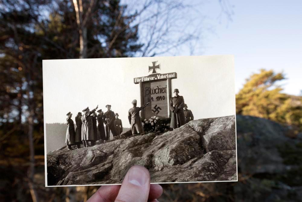 Oscarsborg, 1943. The fast invasion of Oslo was extremely important for the Germans but it was here where the greatest trouble was awaited them. The cannons of the Oscarsborg Fortress were fired against the German cruiser Blücher that sunk with the landing on board. In the photo, German officers salute the memorial of the deceased cruiser at Oscarsborg.