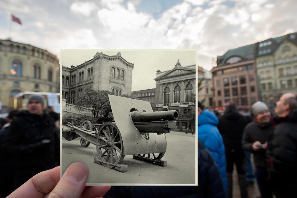 Eidsvoll Square, 1941. German propaganda exhibition of Soviet trophy weapons was held in autumn 1941 on a square in front of the Parliament.
